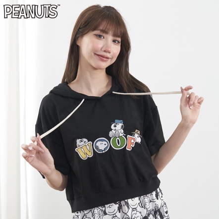 史努比笑哈哈雪紡拼接寬版短袖T恤(黑)