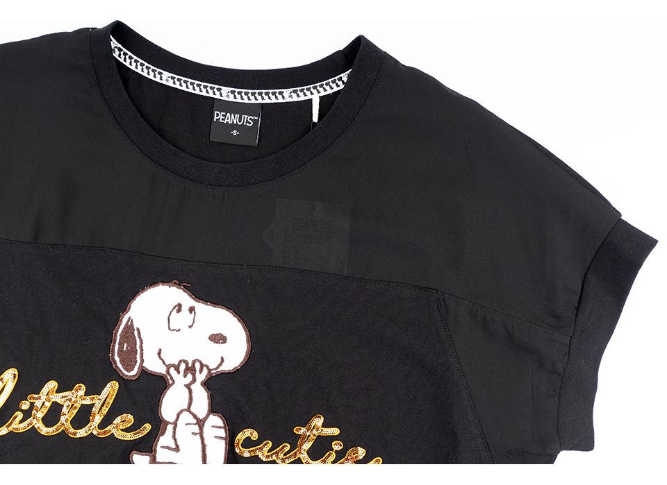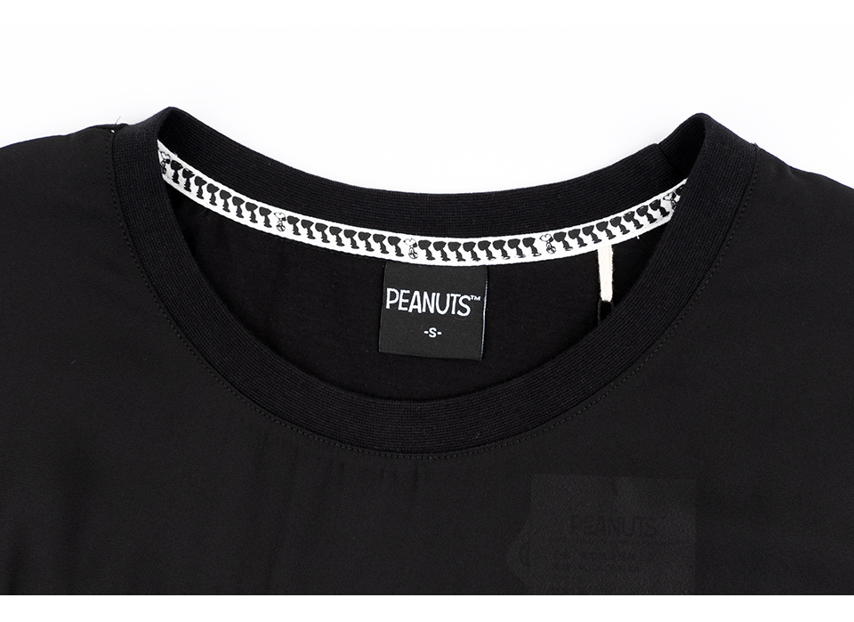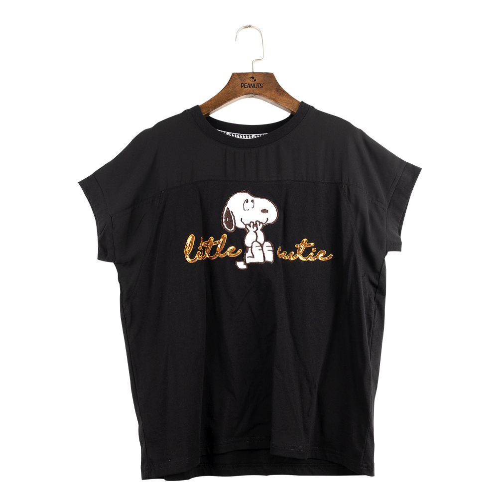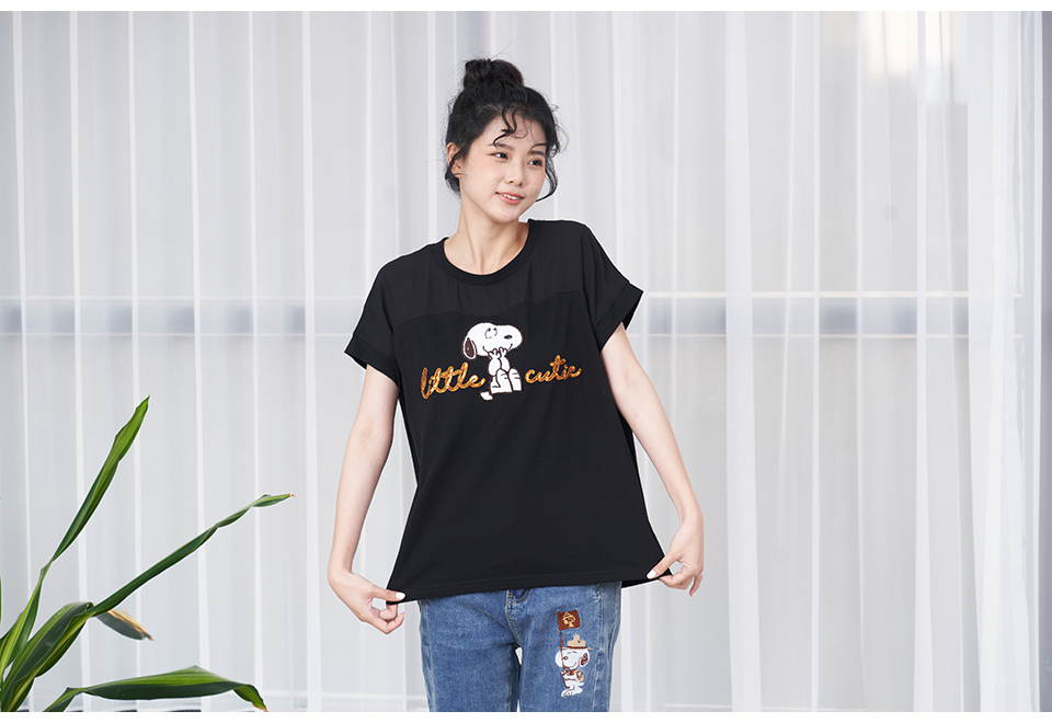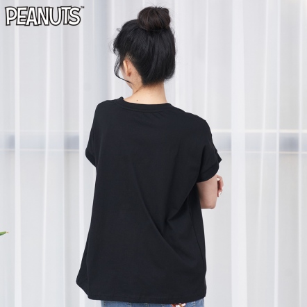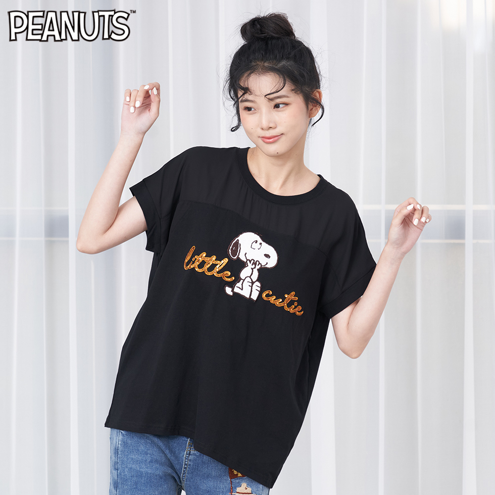 史努比笑哈哈雪紡拼接寬版短袖T恤(黑)