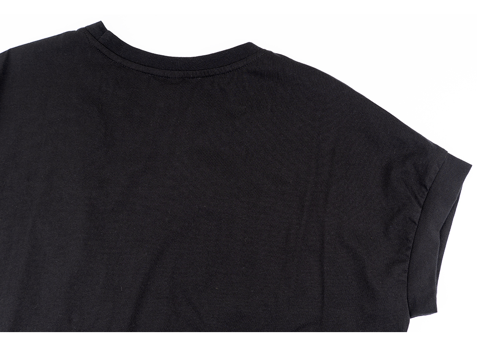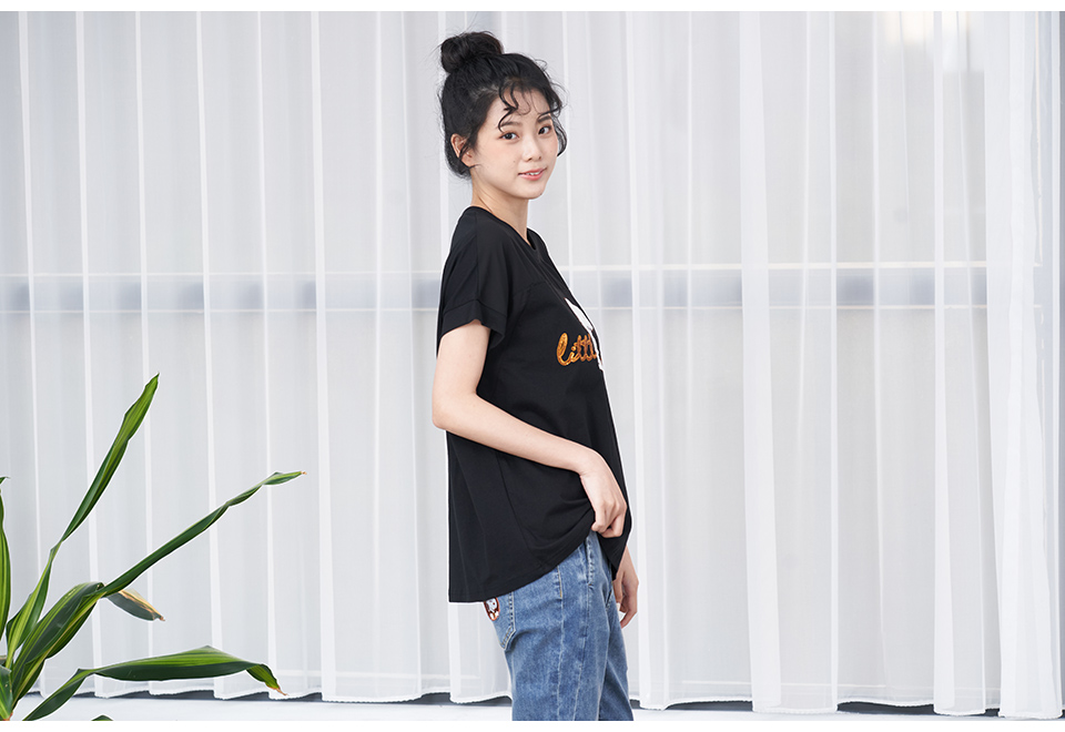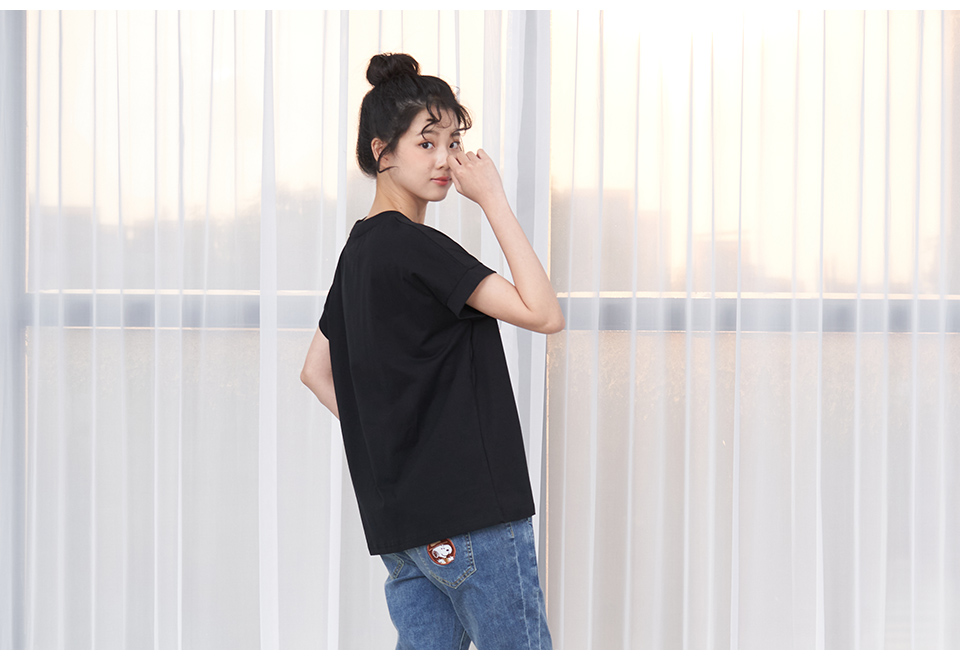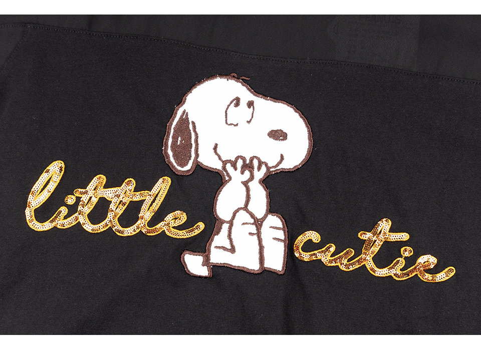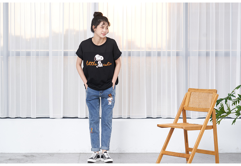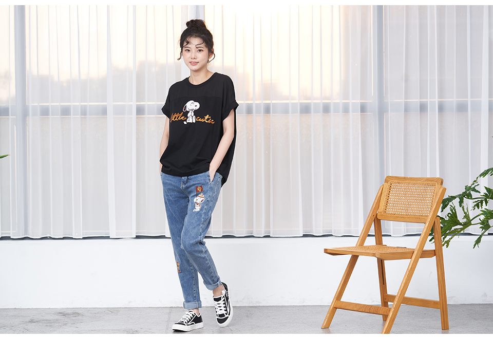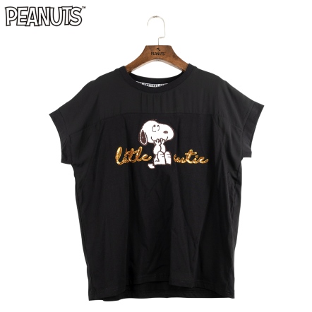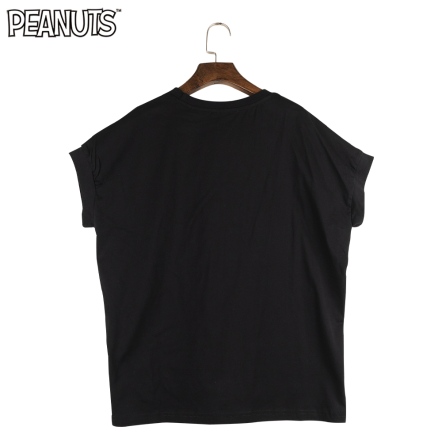 史努比笑哈哈雪紡拼接寬版短袖T恤(黑)